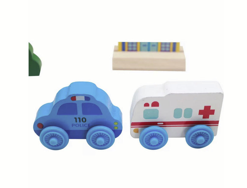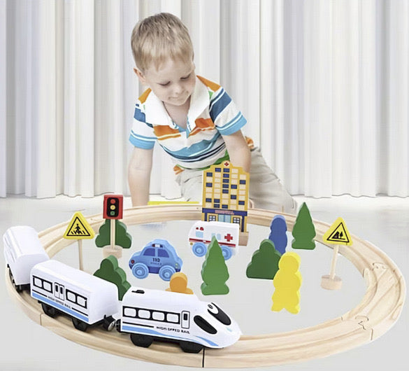 Aceasta jucarie Montessori, confectionata din lemn, este un mic oras complet echipat, inconjurat de sine de tren. Setul include 26 de piese esentiale pentru a stimula imaginatia si creativitatea copiilor.
