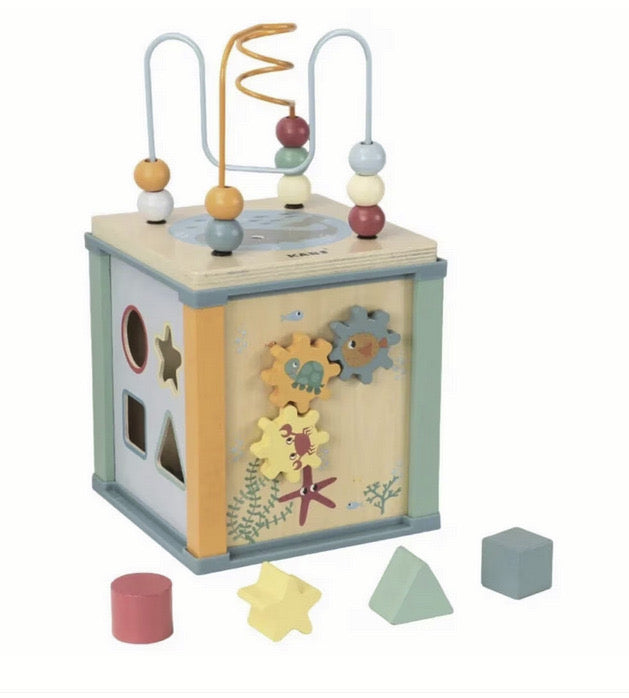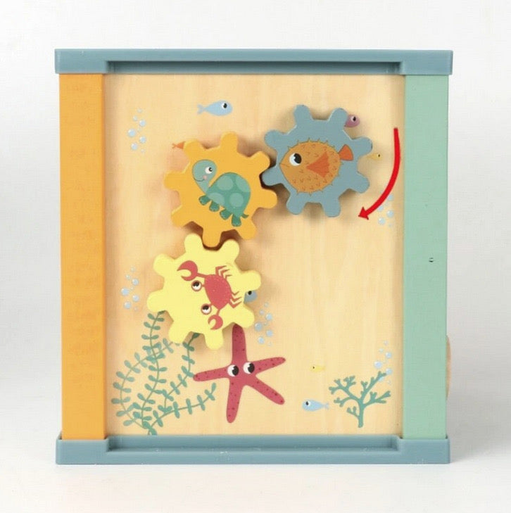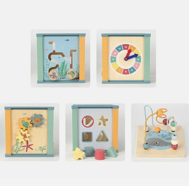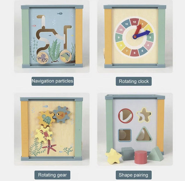 Cub multifunctional 5 in 1 cu functii multiple, avand ca tema oceanul. Are 4 laturi cu activitati distincte si in partea de sus un labirint detasabil cu bilute. Cubul are jocuri educative pentru dezvoltarea motricitatii, sortare si ocazia de a descoperi elemente noi cu obiecte acvatice.