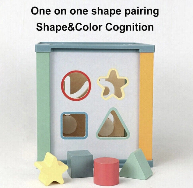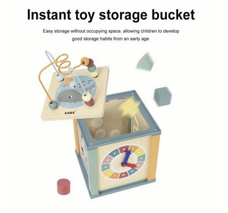 Cub educativ din lemn, pentru copii 2 ani+, 5 in 1, multiple activitati, 18x18.5cm, multicolor