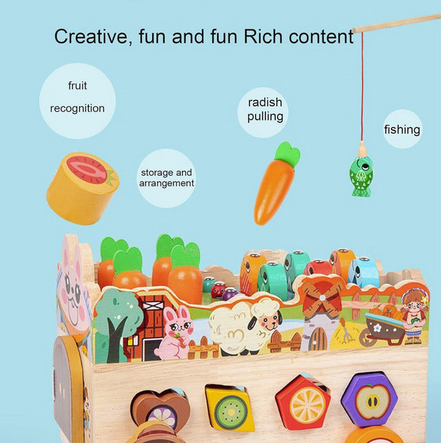Jucaria Educativa din Lemn cu Functii Multiple, inclusiv Carucior Sortator si Pescuit Magnetic, este o solutie excelenta de invatare interactiva pentru copii. Aceasta jucarie polivalenta combina mai multe activitati educationale intr-un singur design plin de culoare si interes, destinat dezvoltarii abilitatilor motorii si cognitive ale copiilor.