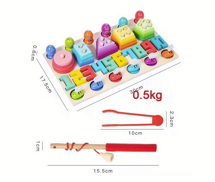 Jucarie educativa, cu numere, pescuit magnetic, sortare forme si prins albinute, din lemn, pentru copii 3 ani+, 32x19x5 cm, multicolor