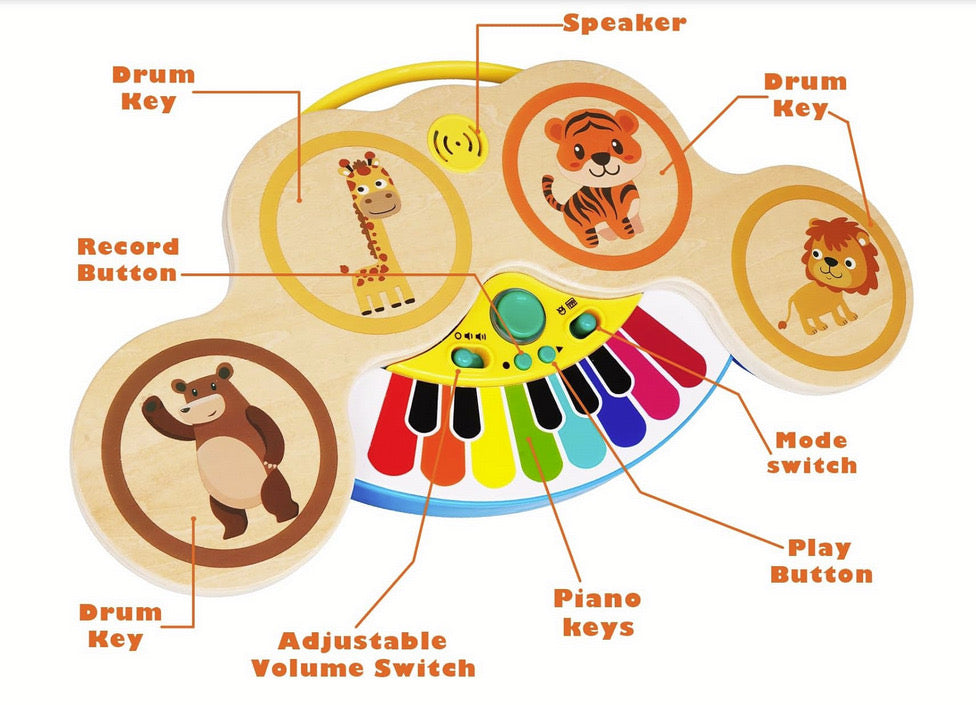 1. Pian Tactil: Pianul Magic Touch este fabricat din lemn si este echipat cu senzori tactile sensibili la atingere. Bebelusii pot presa usor pe tastatura pentru a crea sunete muzicale, ajutandu-i sa dezvolte coordonarea mana-ochi si sa exploreze sunetele.