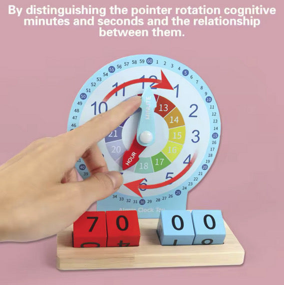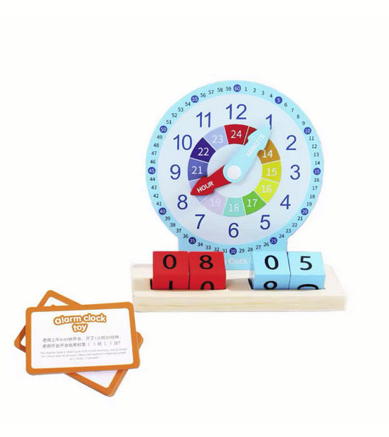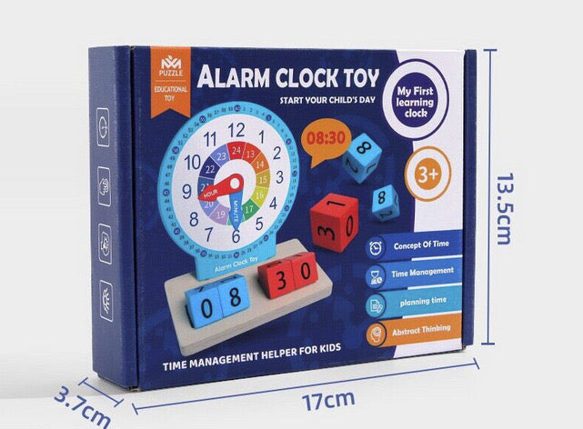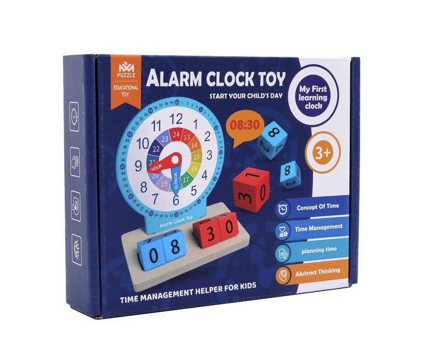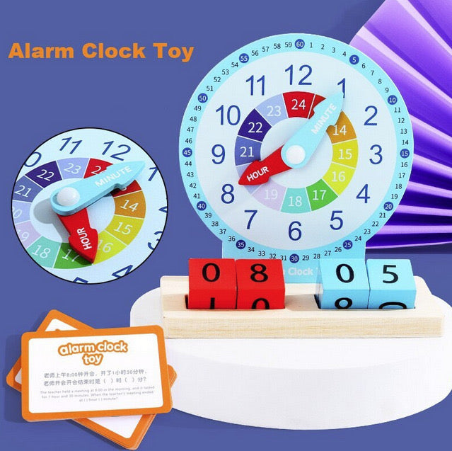 Jucarie Educativa si Interactiva Montessori, Ceas din Lemn cu Alarma, Diferite Forme Geometrice si Cartonase Multicolore, este jucaria ideala pentru ca cel mic sa fie constient de timp.