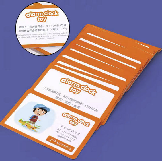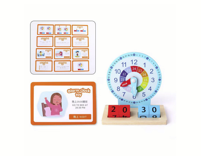 Jucărie Educativă și Interactivă Montessori - Ceas din Lemn cu Alarmă, Diferite Forme Geometrice și Cartonașe Multicolore