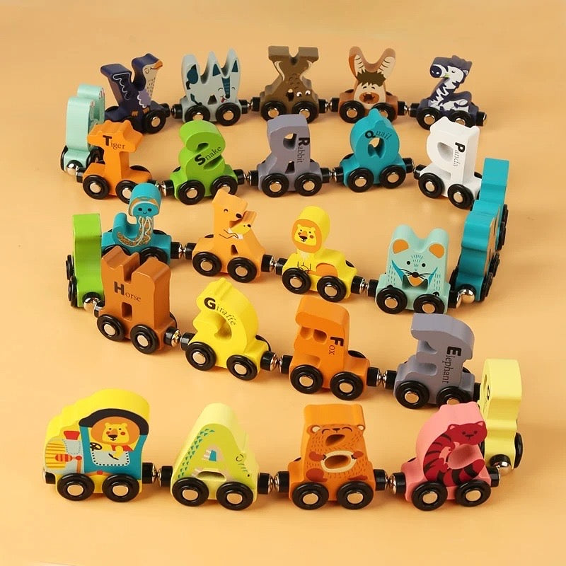 Vagoane cu Litere si Animale: Include 26 de vagoane, fiecare cu litera alfabetului si imaginea unui animal, permitand copiilor sa invete alfabetul prin joaca.