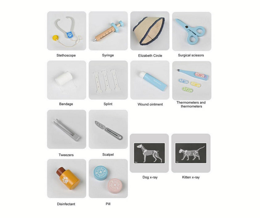Trusa Medicului Veterinar pentru copii din lemn cu 22 de accesorii și cutie de depozitare