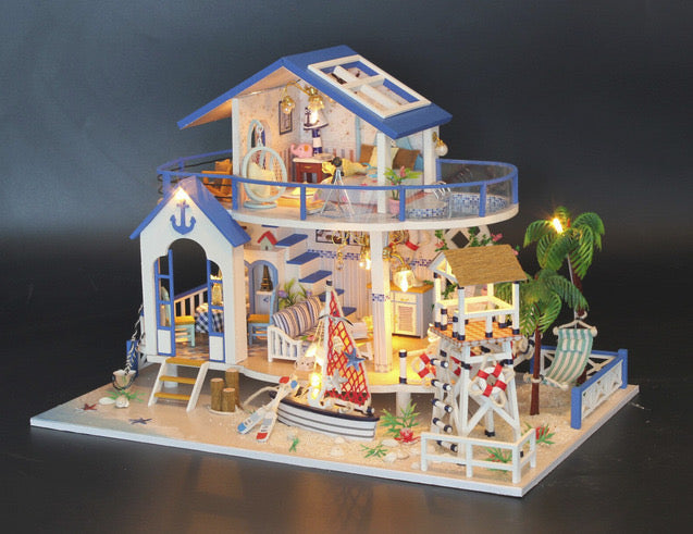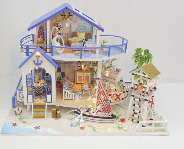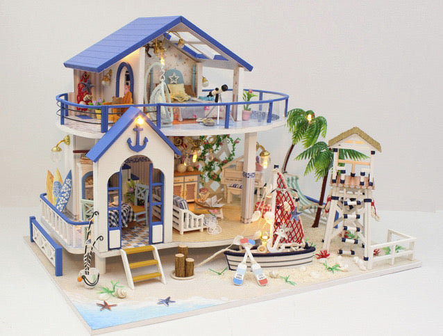 Un ansamblu de casute superb, potrivit pentru mai multi copii sau adulti.Este format din casa principala cu etaj, terase si curte cu casute de vara si locuri de joaca pentru papusi. Este foarte potrivit pentru povesti si jocuri de familie.Nuantele de albastru, mult alb, palmierii si obiectele de joaca sunt inspiratii dintr-un loc ideal, cum ar fi plaja marii scaldata in bucuria soarelui si marii. Toate produsele noastre au la baza conceputul construirii impreuna cu copilul: piesele nu au cuie sau suruburi.Acest lucru creaza si stimuleaza abilitatile si dexteritatile copilului, ii formeaza deprinderi cum ar fi construirea dupa un plan dat sau dupa propria imaginatie.